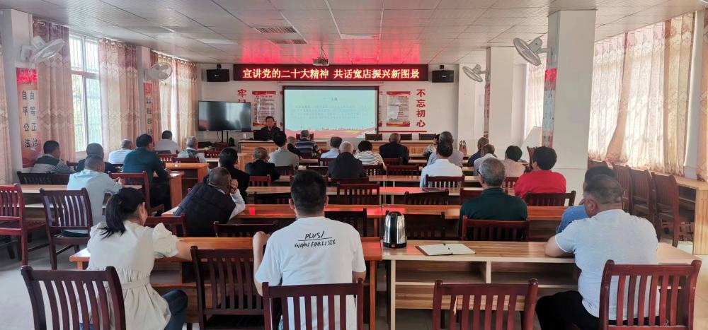 5月19日,市政协“六安红色书院·银龄先锋”微党课宣讲走进霍邱县石店镇宽店村。市人民政协理论研究会会长刘德新以“宣讲党的二十大精神 共话宽店振兴新图景”为主题,向市政协机关驻村工作队、村两委成员和党员群众代表宣讲党的二十大精神。(文/图 蔡欣欣)
